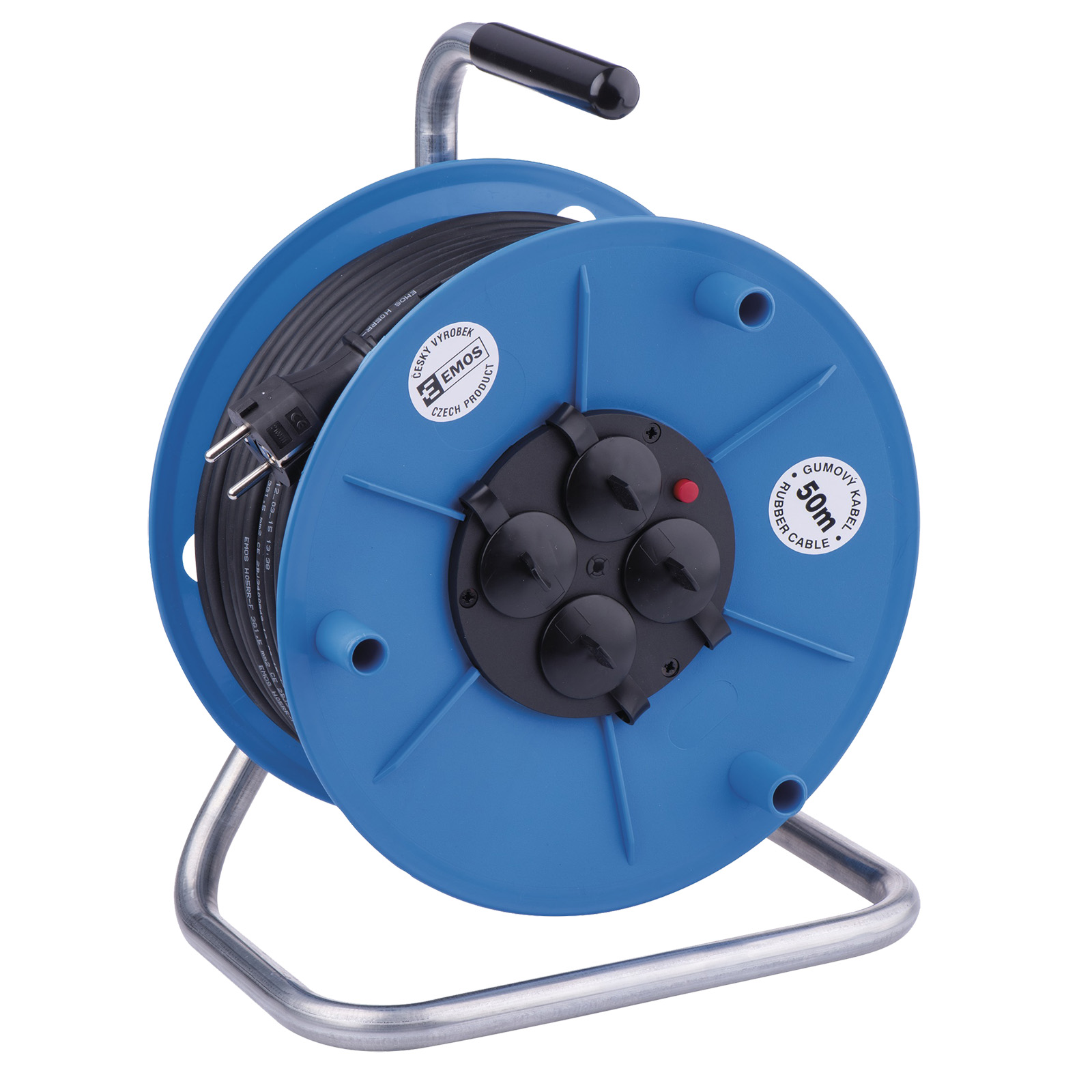Gumový prodlužovací kabel na bubnu se 4 zásuvkami a délkou 25m. Průřez vodiče má 1,5m2 a tepelnou pojistku. Je odolný proti stříkající vodě a ve všech zásuvkách je fáze orientovaná vlevo. Vhodný je pro maximální zátěž 16A / 3680W při plně rozvinutém stavu a 4,8A / 1100W při navinutém stavu.