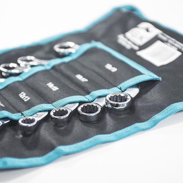 Sada zahnutých klíčů v textilním obalu. V sadě se nachází 5 dílů klíčů: