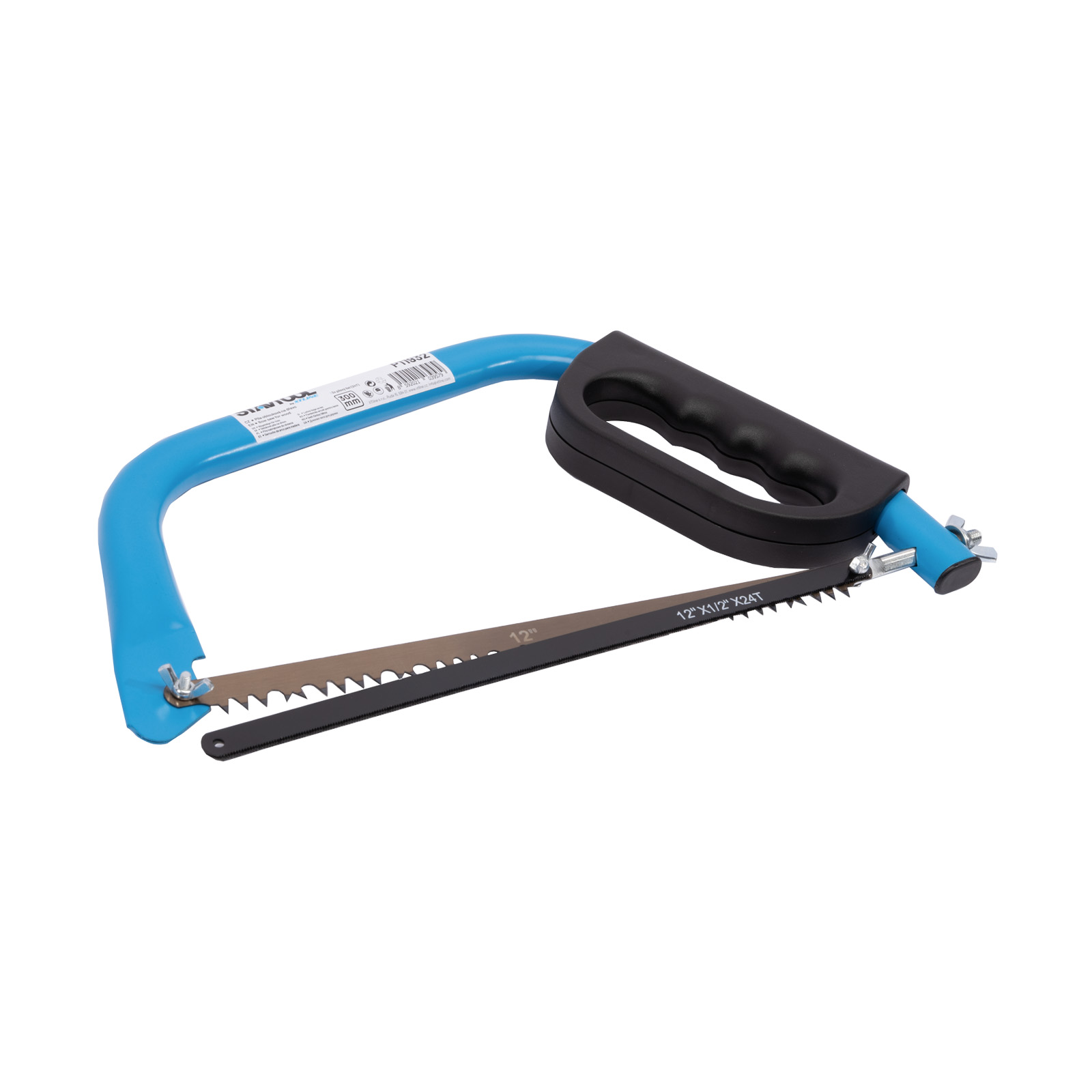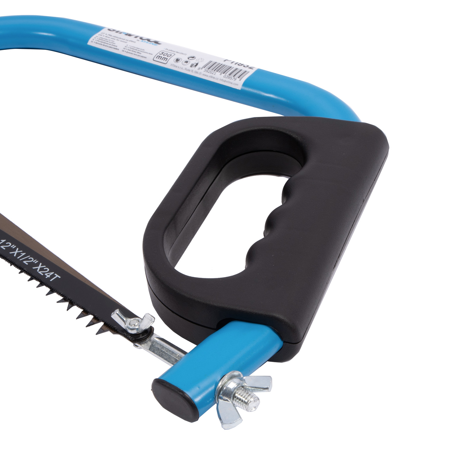 Oblouková pila na dřevo s oválným rámem odolným proti kroucení. Pilový plátek lze rychle vyměnitpomocí křídlových matic a napínací páky.Oboustranně broušené zuby umožňují rychlejší řezání v obou směrech.Měkká gumová rukojeť proti proklouznutí, pilový plátek pro řezání mokrého dřeva.Rychlá výměna a napnutí plátku. Ochrana ruky proti poranění.