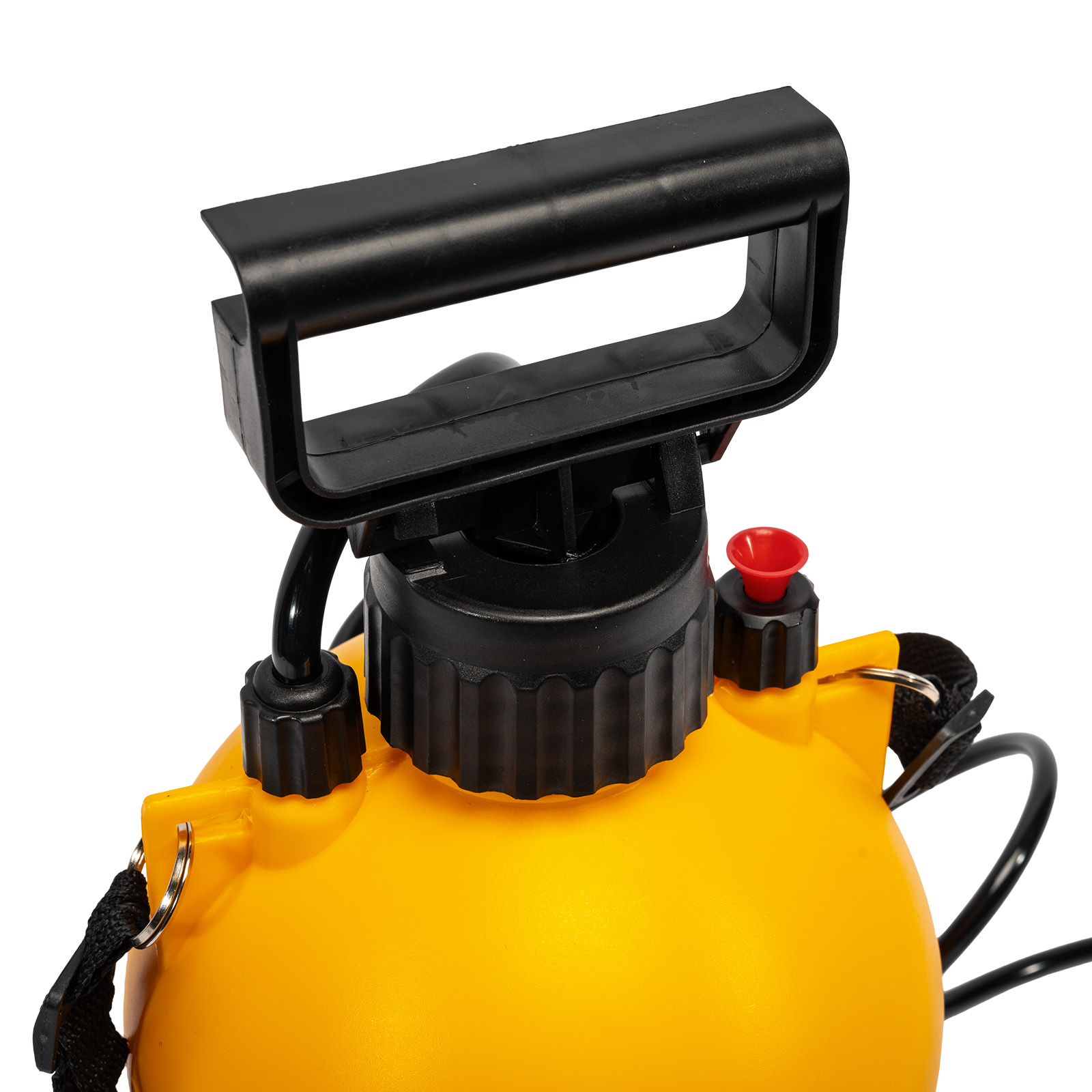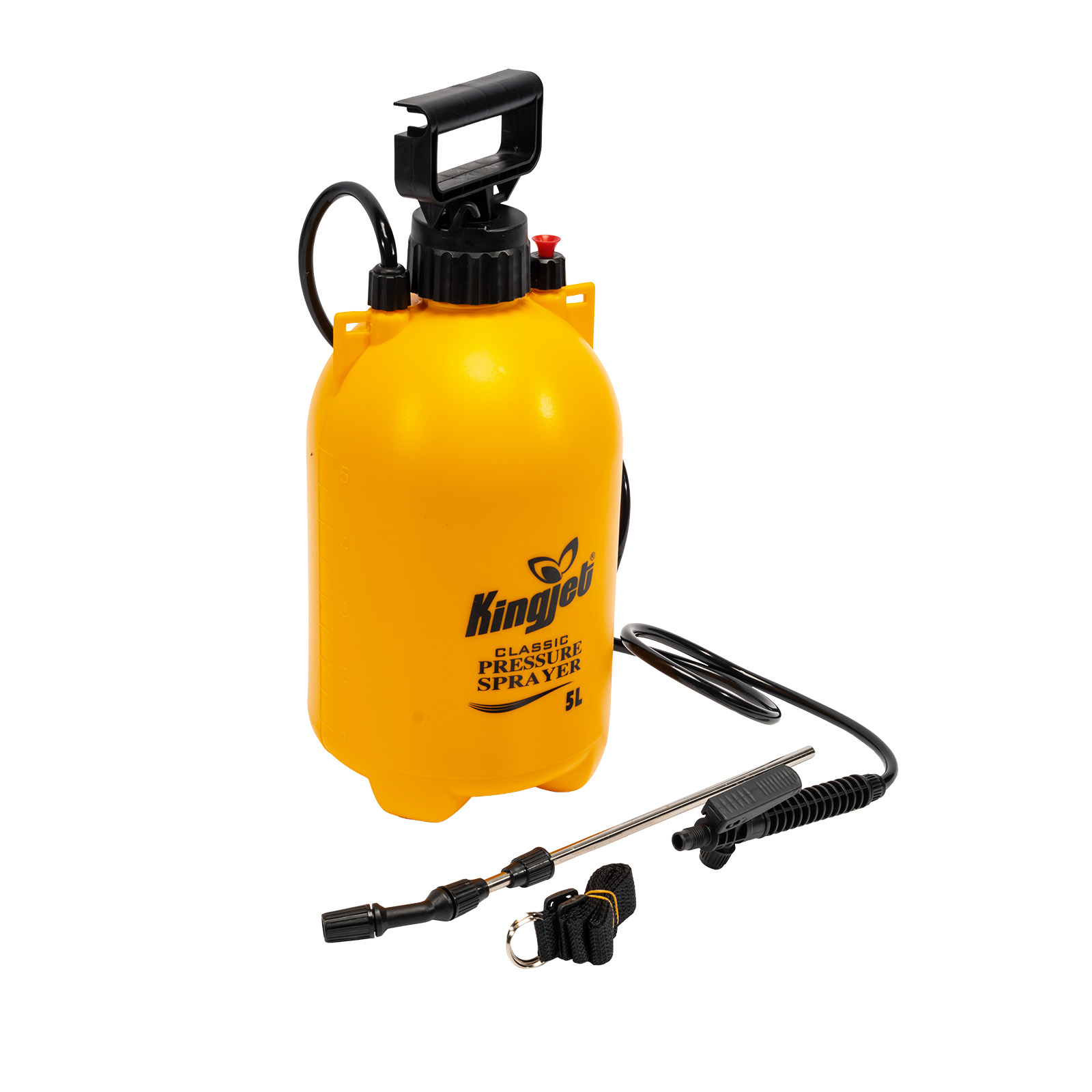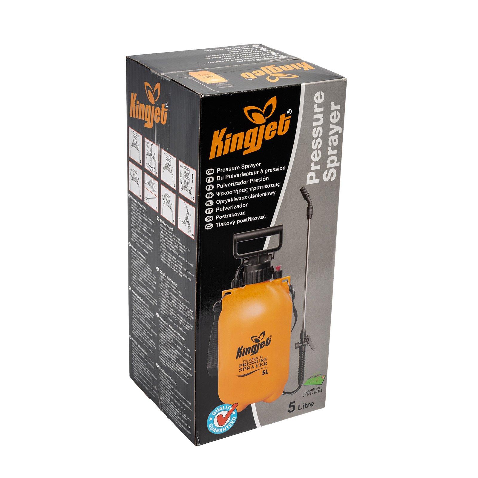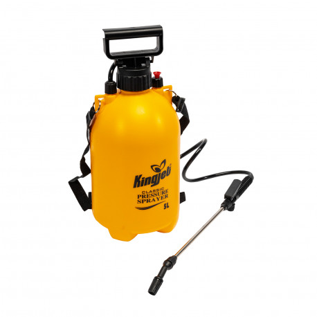Postřikovač tlakový 5l KINGJET. Obsahuje nastavitelnou trysku s možností zajištění stálého postřiku a také nerezový nástavec. Celková pracovní kapacita je 5 litrů. Stejně se zde nachází bezpečnostní ventil, tlak 2,5bar.
