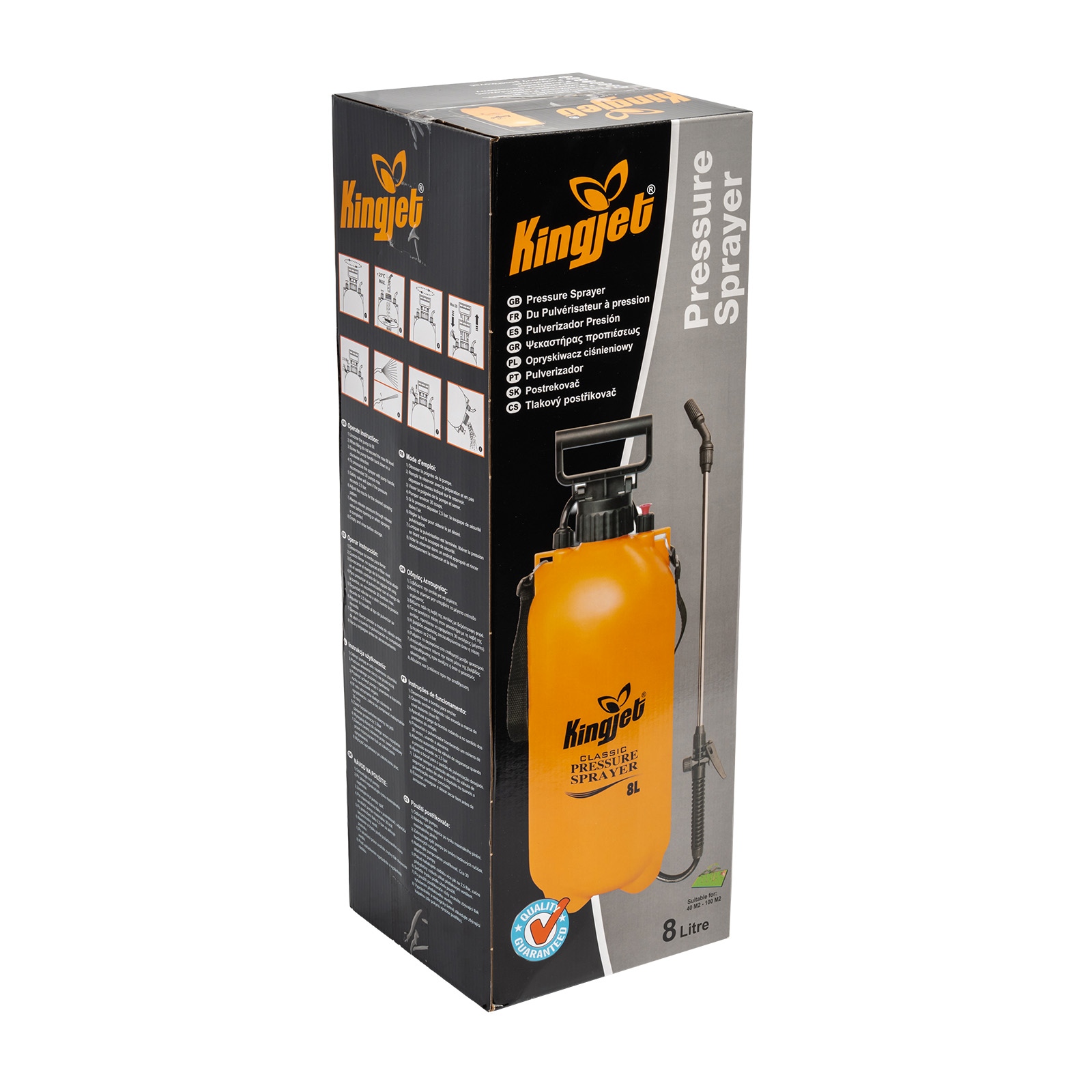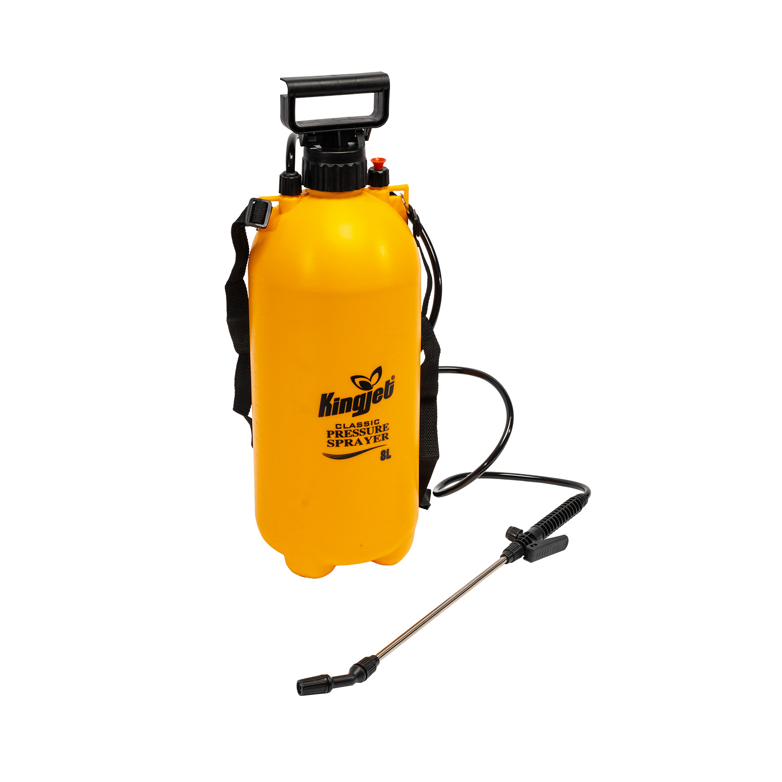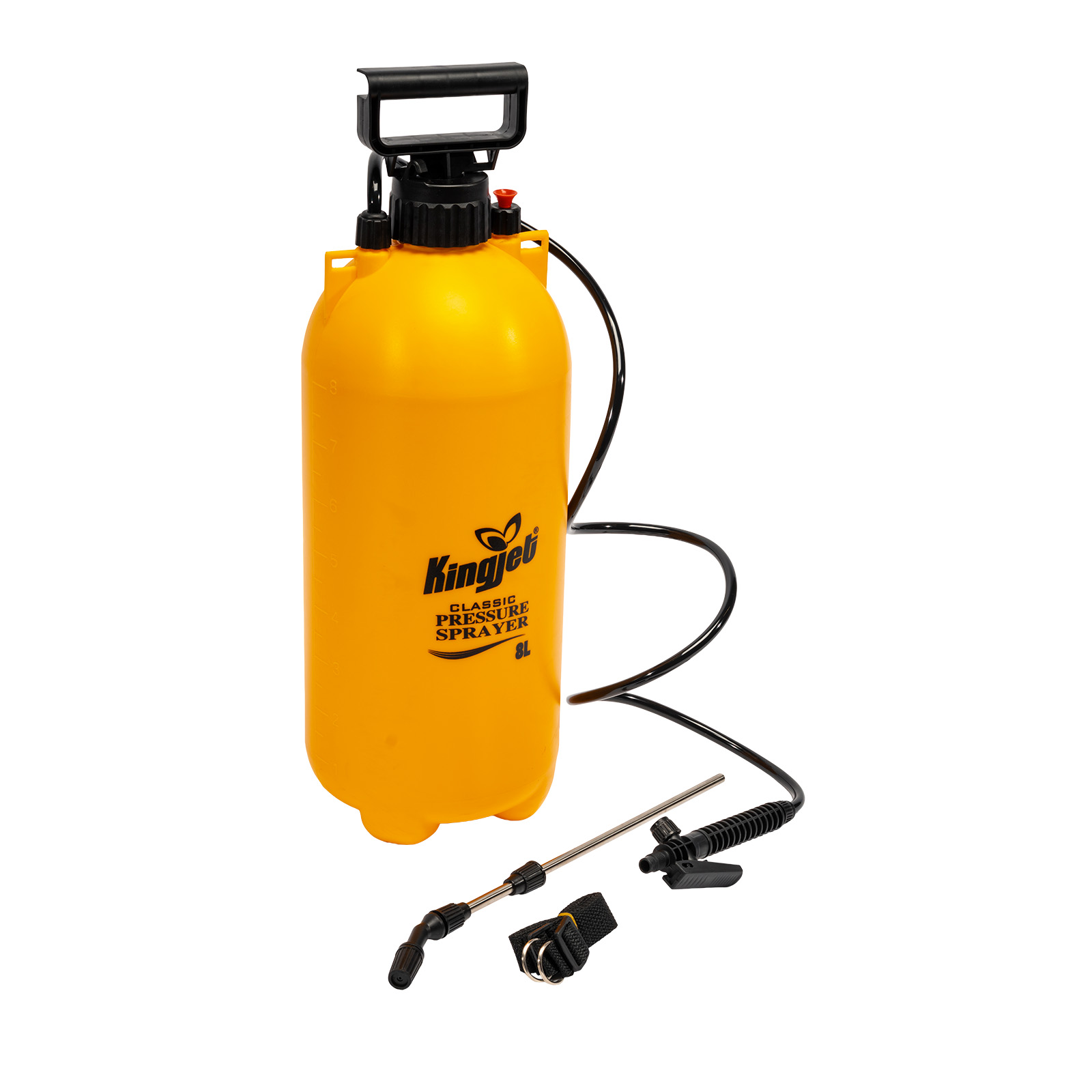 Postřikovač tlakový l KINGJET. Obsahuje nastavitelnou trysku s možností zajištění stálého postřiku, nerezový nástavec. Celková pracovní kapacita je 8 litrů. Nachází se tu taky bezpečnostní ventil, tlak 2,5bar.