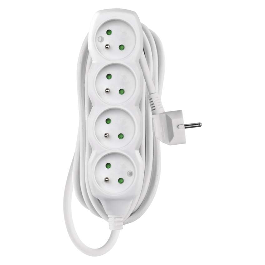 Prodlužovací kabel je praktický pomocník do domácnosti. Je bílé barvy. Podle počtu a provedení zásuvek můžete zapojit více spotřebičů do jedné zásuvky vzdálené od elektrické zástrčky.