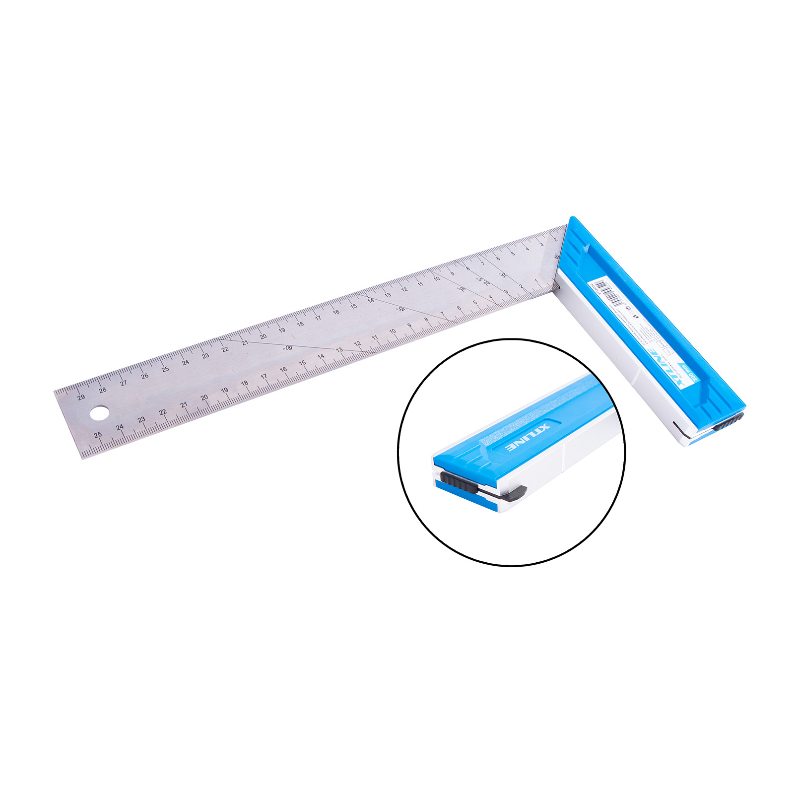 Praktický příložný úhelník s přesným metrickým značením s výbornou čitelností, nerezovým pravítkem a držadlem z kvalitní slitiny hliníku a plastu. Zabudovaný výsuvný doraz v držadle nabízí vynikající komfort a přesnost při práci bez nutnosti přidržovat úhelník rukou (90°). Pravítko má předznačené úhly 15°, 22,5°, 30°, 45° a 60°.